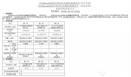 日前,东风本田一则预算超千万的直播短视频项目公布了中标候选人名单。令人意外的是,三家入围的投标企业都来自广东。谁是最后赢家呢?