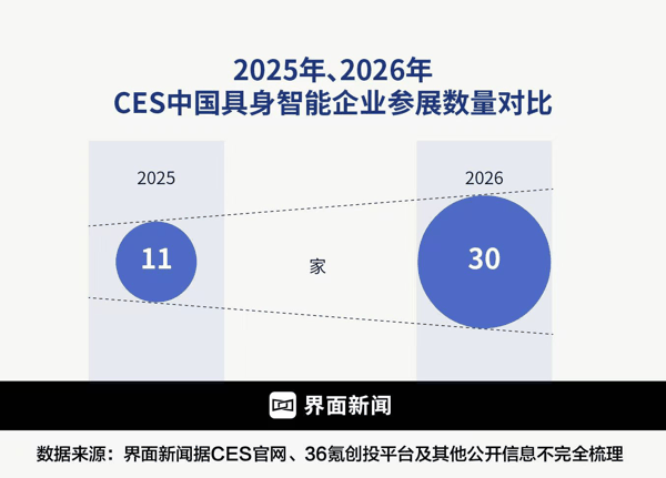 每年固定在美国拉斯维加斯举行的CES( 国际消费类电子产品展览会 ),正在成为中具身智能厂商出海战略的必经关口—— 他们 从2025年近10家拥有独立展台的中国机器人小队,到2026年已经扩充为一个近30家企业组成的中国机器人军团。