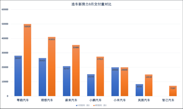 新势力3月销量环比大幅提升:零跑重回5万辆大关理想超4万辆