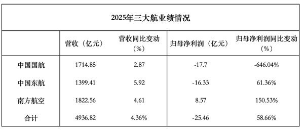 截至4月1日, 中国国航 、 中国东航 、 南方航空 均已完成2025年年报披露。数据显示,2025年,三大航合计实现营收4936.82亿元,同比增长4.36%;归母净利润-25.46亿元,同比增长58.66%。