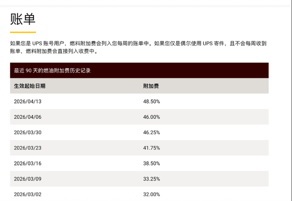 国际 物流 企业UPS燃油附加费费率从1月19日当周的28.25%,一路涨至最新的(4月13日—4月20日)48.5%,上涨了20.25个百分点。