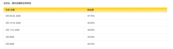 国际 物流 企业DHL网站显示,其当日达、德国国内及国际定时特派产品,4月13日—4月19日燃油附加费费率为46%,而4月20日—4月26日上调为47.75%,为4月份第三次上调。