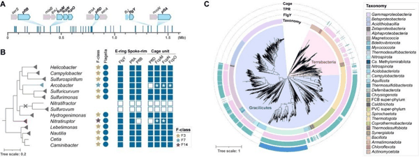 进化分析显示,笼状结构是弯曲菌门的特有结构,而E环和辐条结构广泛存在于多种具有鞭毛的物种中,暗示其可能起源于细菌共同祖先,演化历史久远。研究进一步揭示,弯曲菌门自深海热液口祖先开始,其鞭毛马达“借用”了IV型菌毛系统的部分结构单元,形成了包裹定子复合体的辐条与笼状结构,是细菌大分子机器演化过程中一次典型的“拓展适应”事件。