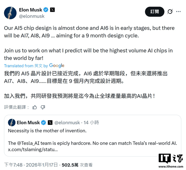 IT之家 1 月 18 日消息,埃隆 · 马斯克昨天在 X 平台表示,特斯拉 AI5 芯片已接近设计完成,而 AI6 芯片目前处于早期阶段,后续还将推出 AI7、AI8、AI9,目标是在 9 个月内完成设计周期。