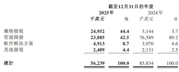 2025年, 英矽智能 实现收入约5620万美元,包括来自药物发现的2500万美元、来自管线开发的2390万美元、来自软件解决方案的490万美元及来自其他发现的250万美元。