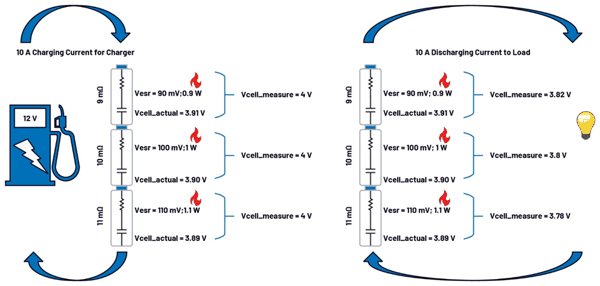 图 2. 电池包充电和放电过程中电芯阻抗不匹配的影响