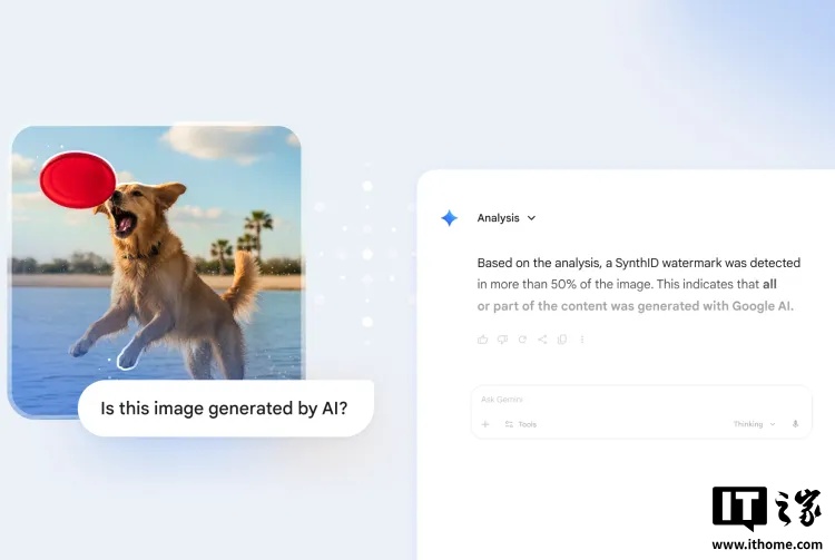 IT之家 11 月 20 日消息,谷歌正让 Gemini 用户能更轻松地检测部分 AI 生成内容。即日起, 用户可以使用 Gemini 应用来判断一张图片是否由谷歌的 AI 工具创作或编辑 ,只需问 Gemini“这是 AI 生成的吗?”即可。