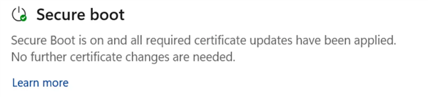 新增的三色提醒机制如下:绿色对勾表示设备已完成所有必要的Secure Boot证书更新和启动管理器安装,无需任何操作。
