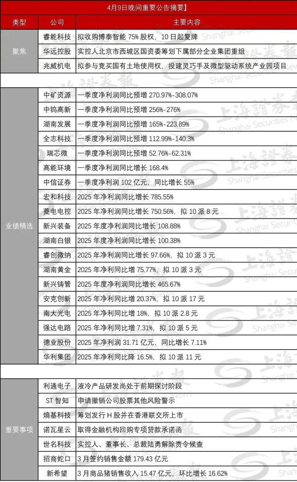 中钨高新 :披露一季度业绩预告。公司预计2026年第一季度实现归属于上市公司股东的净利润9亿元—9.5亿元,比上年同期(重述后)增长256%—276%。报告期内,受 钨 原料市场整体供给偏紧、下游需求旺盛等因素影响, 钨 原料价格大幅上涨,销量同步增长;同时,公司依托全产业链优势,有效实现价格传导,叠加 工程机械 、高端制造下游行业需求上升,硬质合金产品订单稳步增长,实现量价齐升,显著提升整体盈利水平;受益于 PCB 刀具市场需求旺盛,公司紧抓行业发展机遇,持续优化产品结构,推动微型精密刀具等产品实现量价齐升,进一步增强盈利能力。