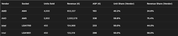 至于AM5平台,则占据了60%的销量份额,平均单价达到336欧元,贡献近75%的营收。
