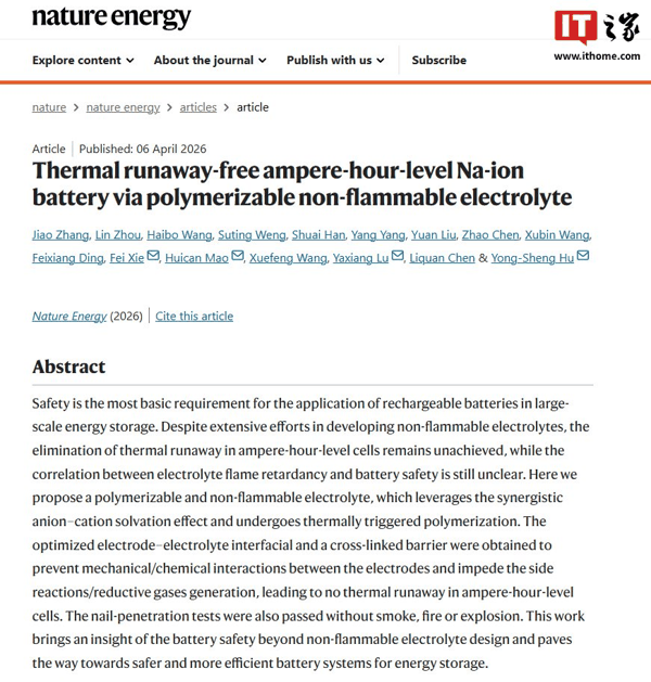 IT之家 4 月 6 日消息,综合科技日报报道和中科海钠今日分享,中国科学院物理研究所、中科海钠胡勇胜研究员团队成功开发出一种具有自保护功能的可聚合不燃电解质(PNE), 全球首次在安时级钠离子电池中实现彻底阻断热失控 。