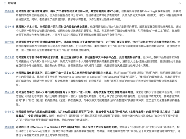 我在复盘时发现一个有趣的细节:老师在讲「Memory, like olives, is an acquired taste.」这句话如何翻译时,用了相当长的篇幅分析「acquired」,AI 纪要把这段内容压缩成了要点,而不是一堆原话的堆砌。