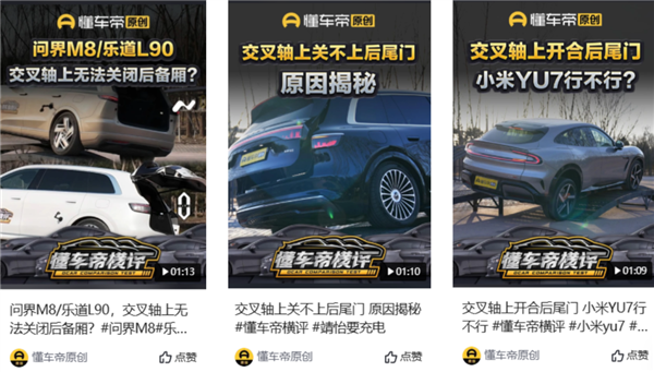 事情的起因,是两天前懂车帝在自己的原创频道里发了这样几期测试的视频。 他们把现在很火的几台新能源 SUV 都开到了交叉轴上,然后在车身静止的状态下看它们的车门或者后备厢能不能正常关闭。