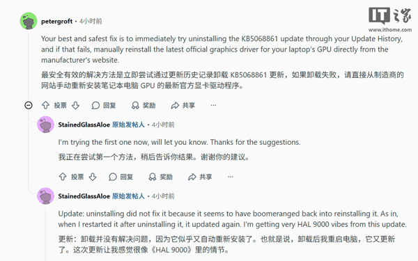 有用户在评论区建议他从显卡制造商官方下载驱动重新安装, 但尝试后问题依旧存在 ,同时该更新还会在每次重启后自动重装,几乎无法彻底删除。