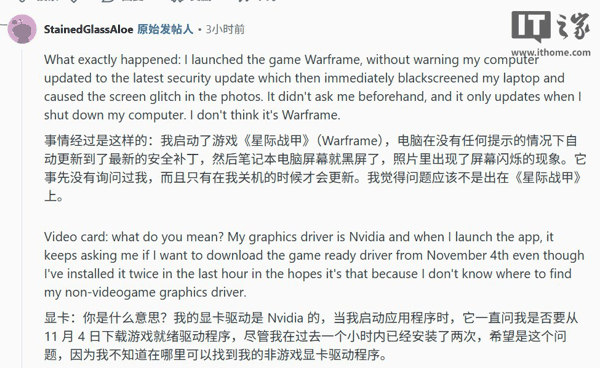IT之家在此援引 Windows Report,这名用户还指出,这台电脑在安装更新后屏幕就会被锁死在最高亮度,同时无法重装 NVIDIA 显卡驱动程序,反复提示重新下载同一个 Game Ready 驱动, 并且日常使用电脑点击应用程序时会随机弹出右键菜单及 UAC 提权窗口 ,疑似是驱动文件或系统损坏。
