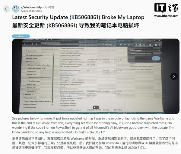 用户 StainedGlassAloe 在 Reddit 论坛表示,他用笔记本电脑玩《星际战甲》时被自动安装了 KB5068861 补丁,随后电脑开始出现黑屏、亮度无法调整等异常现象, 且他并没有点击过安装更新按钮 , 就算卸载掉更新 , 电脑也会在重启时又自动装回去 。