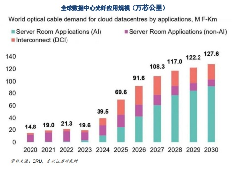 根据CRU最新报告,2026年全球数据中心光纤需求预计达到9160万芯公里,同比增长32%。根据具体应用场景,可以看到,2026年 AI应用 、非 AI应用 和数据中心互连(DCI)应用的光纤需求均实现较快增长。展望2030年,全球数据中心光纤需求预计达到1.28亿芯公里,其中AI应用的光纤需求超过8000万芯公里,成为重要增长 驱动力 。