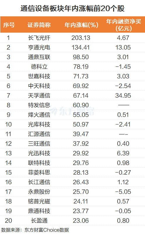 从杠杆资金角度来看, 天孚通信 、亨通光电年内被融资净买入超10亿元,具体分别为34.95亿元和13.05亿元。长飞光纤、 通鼎互联 等被融资净买入过亿。