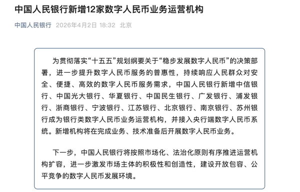 新增12家!数字人民币运营机构扩容至22家,城商行首次入局