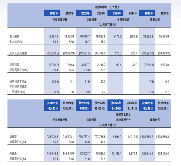 中国信达的核心业务——不良资产经营表现不佳,是公司业绩疲软的主要原因。截至2025年6月末,公司不良资产经营业务总资产为9382.29亿元,较上年末增长2.51%,但这块业务的分部总收入只有184.92亿元;更令人担忧的是,2025年上半年中国信达不良资产经营业务出现了62亿元的税前亏损。