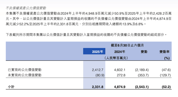 半年报披露,计入损益的困境债务资产公允价值变动从48.75亿元降至23.32亿元,其中已实现公允价值变动从46.02亿元降至24.13亿元,未实现公允价值变动从2.73亿元转为-0.81亿元。也就是说,在“收购力度加大”的同时,对不良资产的处置节奏放缓,加上市场波动,导致已实现收益下滑、未实现估值转负。