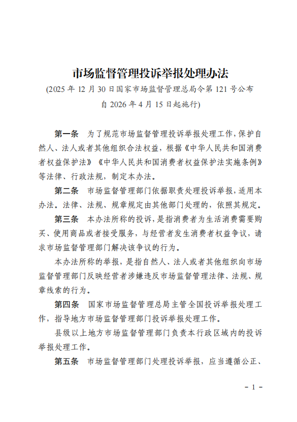 (2025 年 12 月 30 日国家市场监督管理总局令第 121 号公布自 2026 年 4 月 15 日起施行)