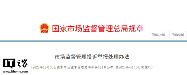 IT之家 1 月 10 日消息,为适应市场监管新形势新要求、提升投诉举报处理质效、更好保护消费者和经营者合法权益,市场监管总局今日公布了《市场监督管理投诉举报处理办法》(IT之家以下简称《办法》)。