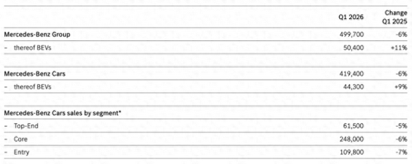 4月9日,梅赛德斯-奔驰集团在官网发布2026年第一季度销量报告。数据显示,该集团第一季度全球销量为49.97万辆,同比下滑6%。其中,梅赛德斯-奔驰乘用车业务全球销量为41.94万辆,同比下降6%,符合该公司预期。