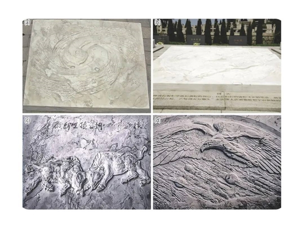 东山浮雕群 (a)无尽无极;(b)创天;(c)核子重如牛,对撞生新态;(d)大鹏。