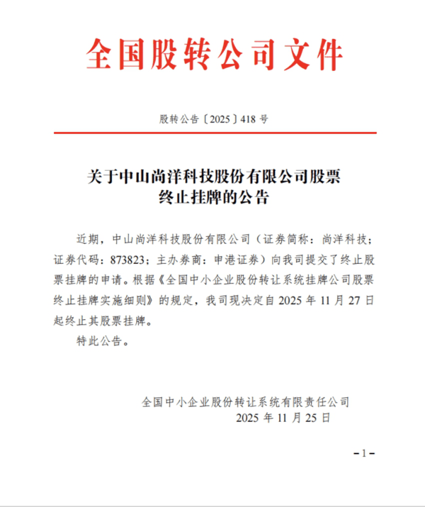 【亿邦原创】 11月27日,美容美妆工具公司中山尚洋科技股份有限公司在新三板正式终止股票挂牌。该公司曾于2018年3月在新三板终止挂牌,又于2022年5月重新在新三板挂牌上市,上市时一度被称为“化妆工具第一股”。
