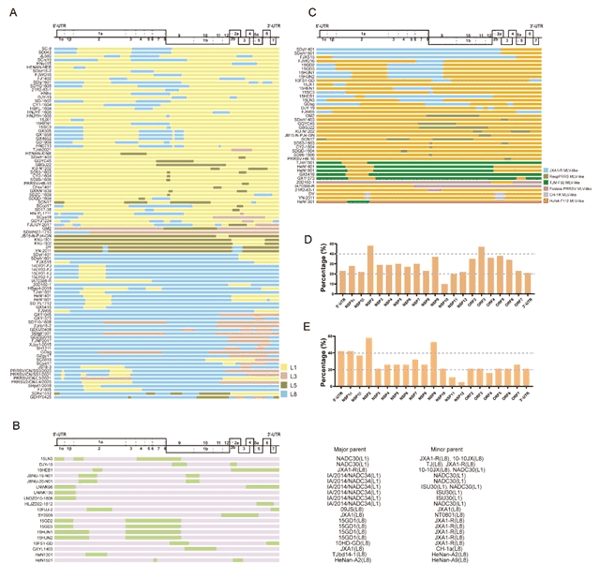 PRRSV的重组具有鲜明的特异性,重组热点区域主要集中在NSP2、NSP9、ORF2-4等与病毒感染和复制相关的基因区域,这可能增强病毒对宿主细胞的入侵能力或复制效率,从而提升其适应性和传播力。L1分支毒株(如类NADC30 PRRSV) 成为近年来重组事件中的主要分支,其重组频率和多样性均呈上升趋势。中国河南、广东、山东及美国爱荷华州、明尼苏达州等养猪高密度地区成为重组高发区。