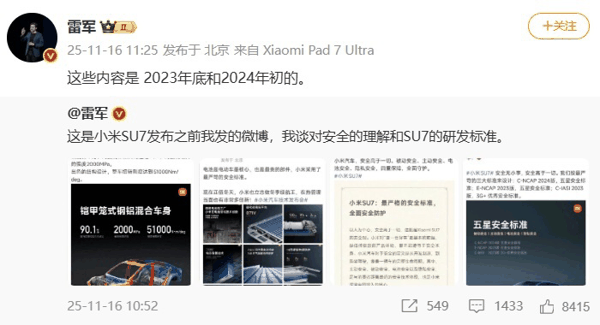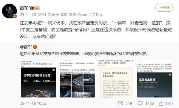 雷军反问,这句话和自己之前提到的「安全是基础、安全是前提」是否矛盾?为了佐证自己的观点,他还附上了几张小米 SU7 发布之前,他谈论车身强度、电池安全等技术标准的旧微博截图。