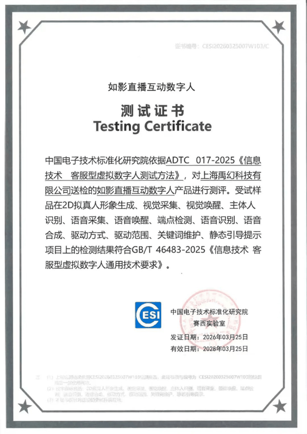 商汤凭借如影直播互动数字人产品,成为第一家获得 虚拟数字人 领域首个国家标准符合性测试证书的企业。这标志着商汤科技在虚拟数字人领域的技术领先性与产品规范化水平再获国家级权威认可。