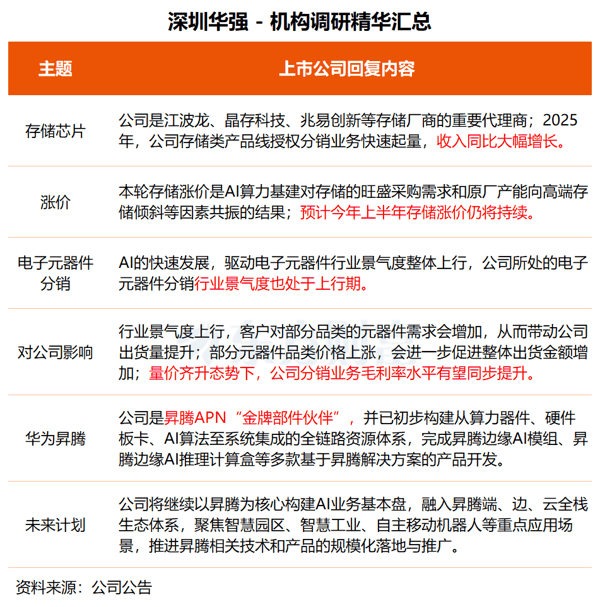 深圳华强 : 电子 元器件分销行业景气度上行 预计上半年存储涨价仍将持续