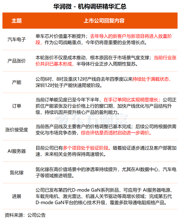 在调研中, 华润微 透露,公司6吋、8吋及重庆12吋产线自去年四季度以来持续处于满载状态,深圳12吋处于产能快速爬坡阶段。当前订单能见度已至今年下半年,在手订单同比实现明显增长。公司正抓住产能紧张及行业价格上行的窗口期,加快产线优化与产品结构升级,持续巩固并提升核心产品的盈利能力。