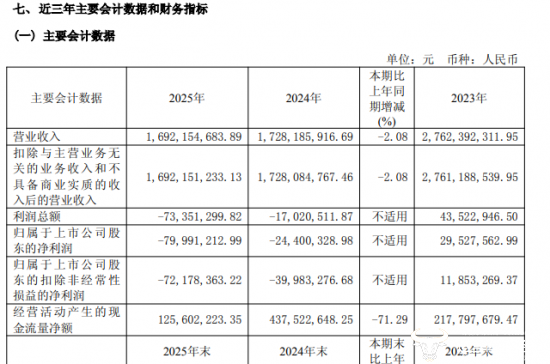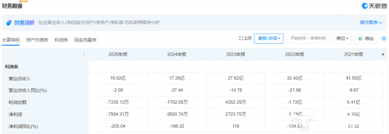 据2025年年报数据显示,该公司全年营收16.92亿元,同比微降2.08%;归母净亏损为7999.12万元,较2024年的亏损2440万元直接扩大了2倍多。