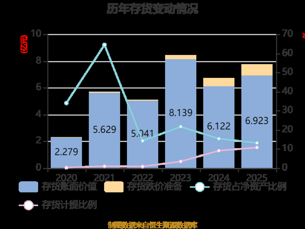 从存货变动来看,截至2025年末,公司存货账面价值为6.92亿元,占净资产的13.1%,较上年末增加8006.16万元。其中,存货跌价准备为8304.65万元,计提比例为10.71%。
