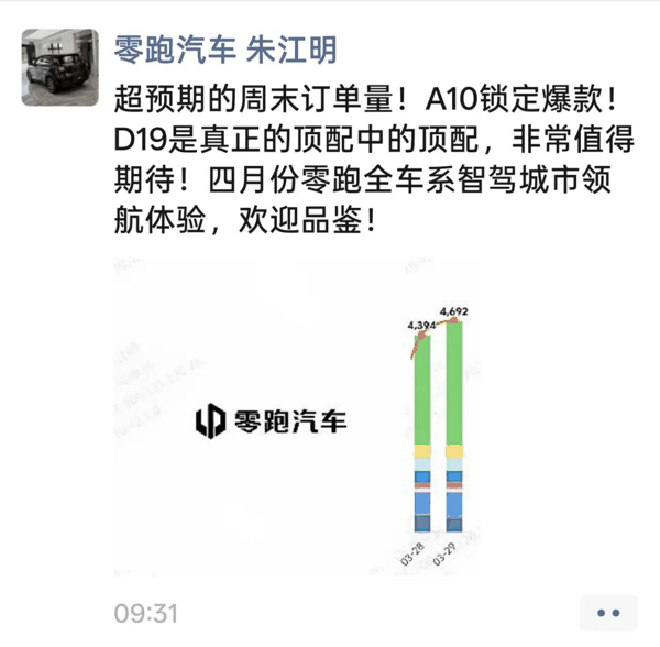 零跑汽车创始人、董事长兼CEO朱江明发布微信朋友圈称:“超预期的周末订单量!A10锁定爆款!D19是真正的顶配中的顶配,非常值得期待!”