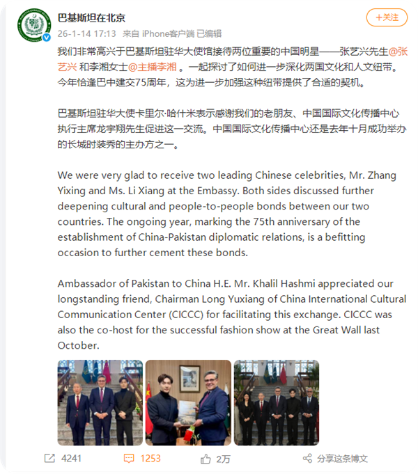 1月14日,她与艺人张艺兴一同现身巴基斯坦驻华大使馆。今年恰逢中巴两国建交 75 周年,李湘此次到访参与探讨了深化两国文化与人文交流合作的相关议题。