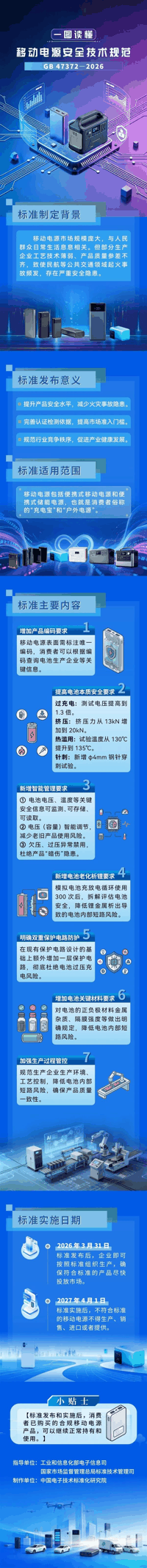 2026年4月3日,工业和信息化部正式颁布《移动电源安全技术规范》强制性国家标准(下称“移动电源新国标”或“新3C标准”)。