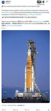 这是美国自1972年“阿波罗”计划结束以来,时隔五十余年再次将执行载人绕月任务的飞行器运抵发射台。