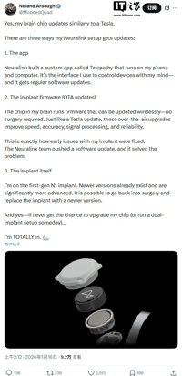 全球首例Neuralink脑机接口受试者揭秘:脑机芯片可像特斯拉一样OTA更新,无需二次手术即可获得升级