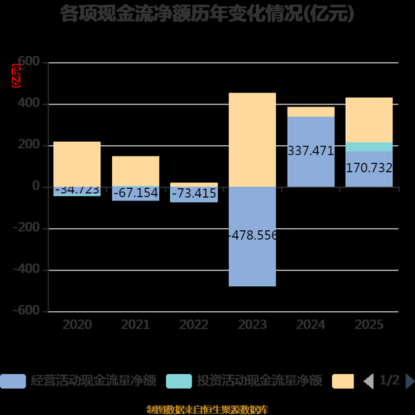 截至2025年,公司经营活动现金流净额为170.73亿元,同比下降49.41%;筹资活动现金流净额213.45亿元,同比增加168.62亿元;投资活动现金流净额43.78亿元,上年同期为6602.98万元。