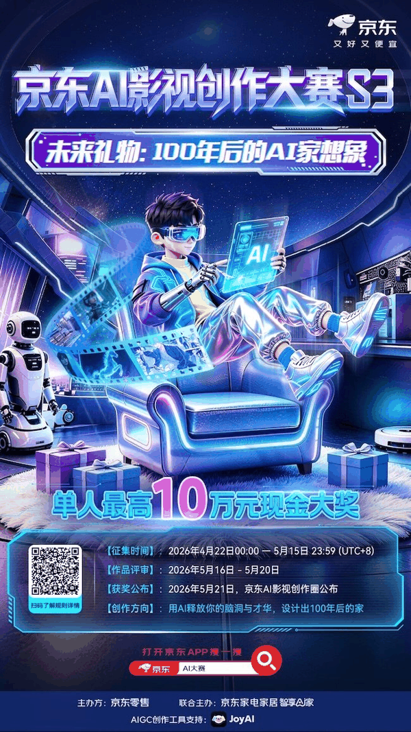 本次大赛由京东旗下万能数字人助手JoyAI提供AIGC创作工具支持。参赛创作者可优先使用JoyAI平台(https://joyai.com/)进行创作,赛事期间还有积分激励。提交15秒以上、具备完整故事情节的AIGC短片参赛,所有作品必须为原创,作品不得包含违反中国法律法规、危害公序良俗或侵犯包括第三方知识产权在内的任意权利的内容。