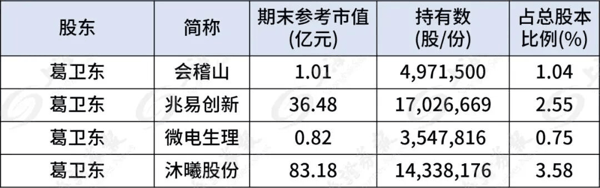 截至4月15日,在已经披露了2025年年报的上市公司中,葛卫东及其关联人王萍、葛贵莲共现身9家上市公司前十大流通股东名单中,合计持仓190.7亿元。