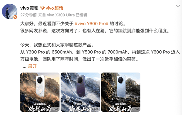 黄韬在微博中回顾了Y系列在续航上的探索历程,从vivo Y300 Pro的6500mAh到vivo Y600 Pro的10200mAh,不到两年就实现了几乎翻倍的突破。这一跃升并非为了参数竞赛,而是为了用户真正的需求、为了生活不再被一根充电线绑着走的每一个人。vivo希望通过Y600 Pro带给用户一份安心可靠,让用户“不用总惦记还剩多少电,只管走你的路”。
