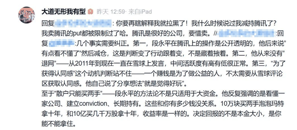 近日,有网友对段永平的投资操作进行了分析,提起他减仓腾讯。段永平回复称:“我什么时候说过我减持腾讯了?我卖腾讯的Put都被限制过了哈。腾讯是很好的公司,要惜卖。”