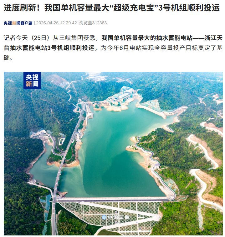 IT之家 4 月 25 日消息,据央视新闻今日报道,记者从三峡集团获悉, 我国单机容量最大的抽水蓄能电站 —— 浙江天台抽水蓄能电站 3 号机组顺利投运 ,为今年 6 月电站实现全容量投产目标奠定了基础。