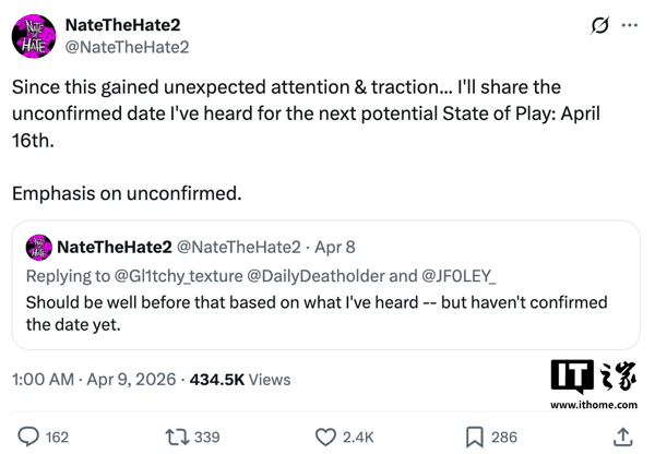 IT之家 4 月 9 日消息,消息源 NateTheHate 透露,索尼将于 4 月 16 日举行 State Of Play 游戏发布会,不过本次发布会中不会出现 PS5 第一方独占游戏。
