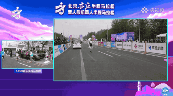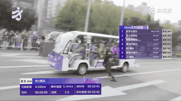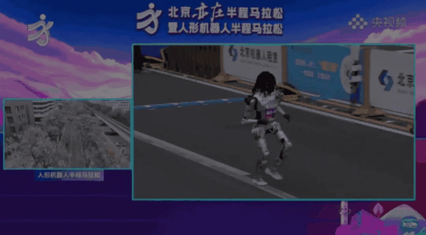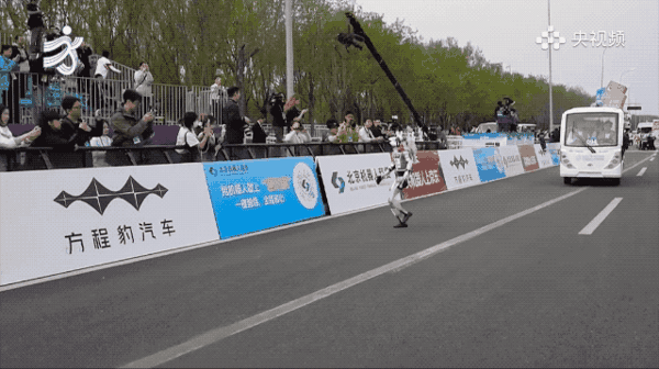 赛道上另一个名场面,真人跑者和机器人并肩竞速,结果机器人一个加速直接超过了人类选手。画面定格的那一刻,堪比一幅世界名画。